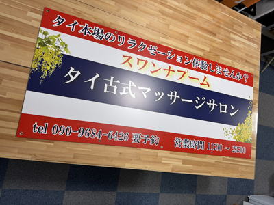 | アルミ複合板の看板 横1820mm×高さ780mm UVカットラミネート施工 シートを背面に巻き込み施工 取付しやすくハトメ施工 |